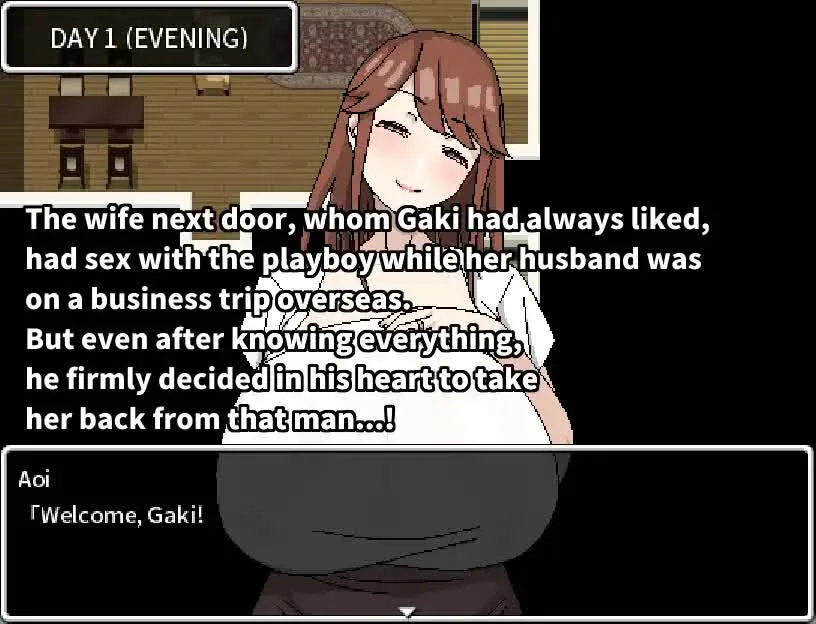 Una noche, Gaki fue testigo de la intensa escena de SEXO de la señora de al lado, que rompe sujetadores, y un playboy. La esposa de al lado, que siempre le había gustado, estaba teniendo sexo con el playboy mientras su marido estaba de viaje de negocios en el extranjero. Entonces decidió. "Definitivamente, conseguiré esas enormes tetas... no, ¡recuperaré a la señora Aoi de ese tipo!"