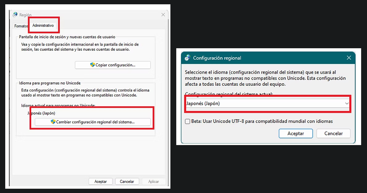 Configuración regional del sistema (el idioma utilizado por defecto para el software que no es compatible con Unicode).